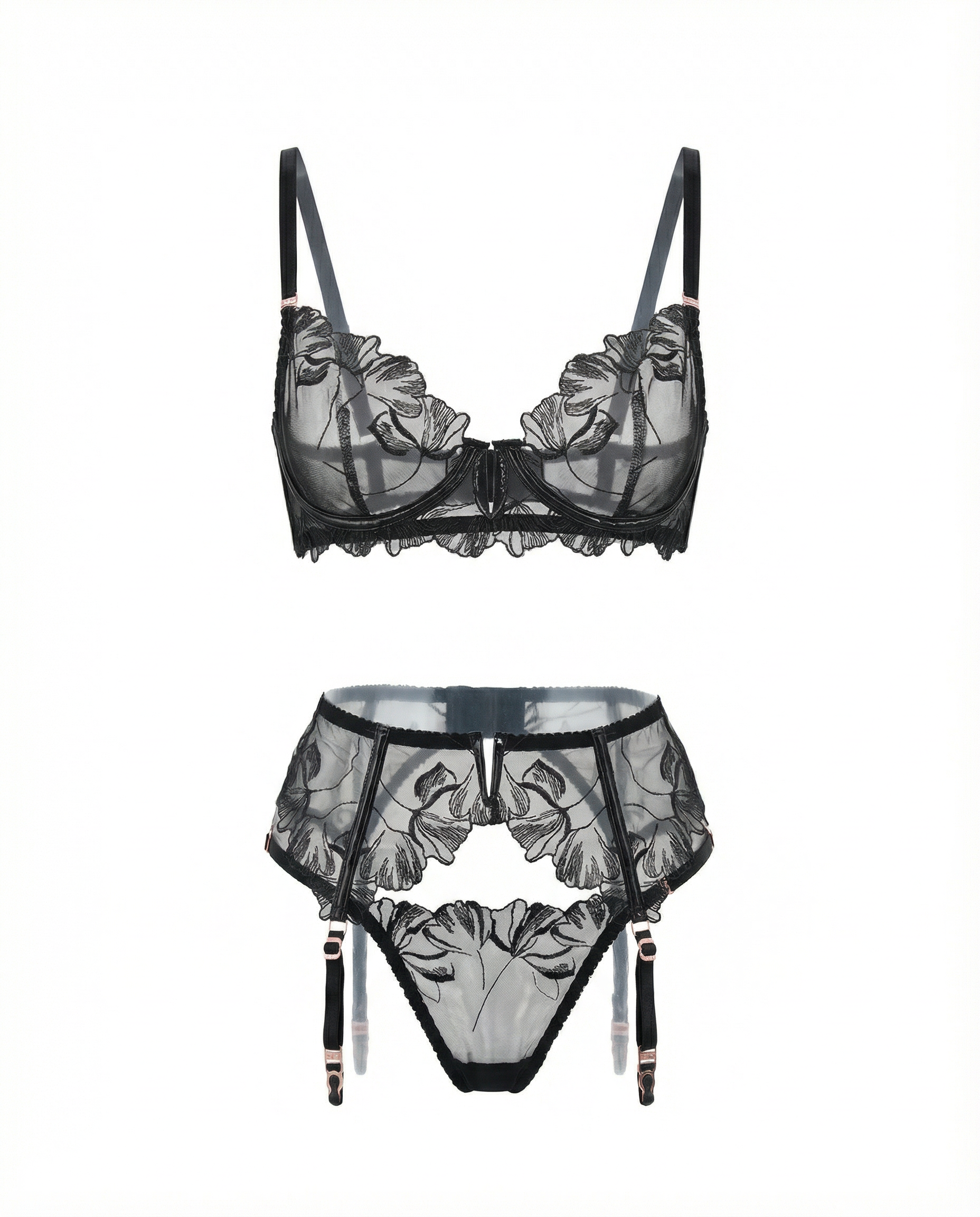 Бюстгальтер из тонкой прозрачной сетки с объёмной вышивкой.