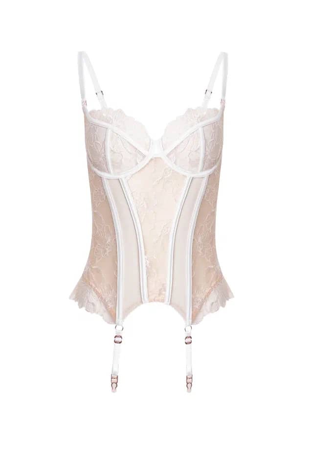 Грация из полупрозрачной сетки с кружевной отделкой и контрастными линиями. Конструкция формирует силуэт и подчёркивает линии тела.